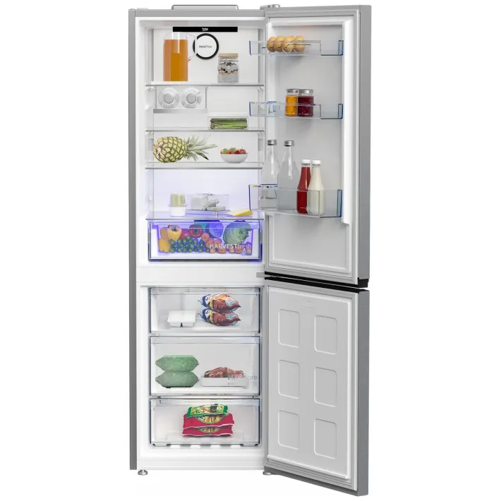 De Beko B5RCNE365HXB koel-vriescombinatie heeft een netto inhoud van 316 liter. Daarvan neemt het koelgedeelte 210 liter in en het vriesgedeelte 106 liter. De koel-vriescombinatie is 186,5 cm hoog en heeft een breedte van 59,5 cm, met een diepte van 66,3 cm. Deze koel-vriescombinatie heeft energielabel D. Het apparaat is voorzien van no frost zodat je het vriesgedeelte nooit hoeft te ontdooien.