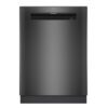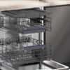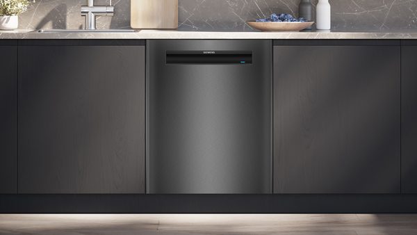 Volledig geïntegreerde vaatwasser met strak, minimalistisch ontwerp. Bediening onzichtbaar in gesloten toestand, met subtiele statusindicatie in de handgreep. -